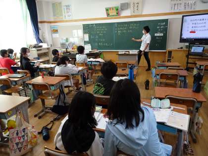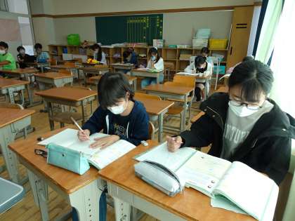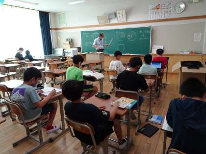 6年2組は算数で円の面積について勉強しました。今日は発展問題に取り組んでいます。先生が二人いますので、教室と学習室を使って、どんどん問題を解きたい人と、先生と一緒にみんなで確認しながら勉強したい人に分かれて勉強しています。