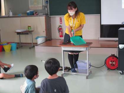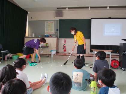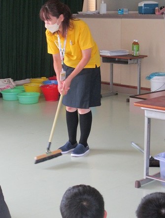 続いて、そうじ用具の正しい使い方のデモンストレーションが行われました。