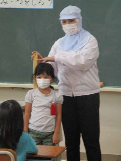 給食センターでは、服のほこりや髪の毛が落ちないように、しっかり白衣や帽子で保護していること、大きな給食センター専用の道具を使っていること(1年生の背たけくらいある大きな道具でした)、毎日たくさんの給食を作っていること(常滑市内全部だと7200食にもなるそうです!)その他にも、調理員さんが毎日とても暑いところで一生懸命調理してくださっていることを知りました。