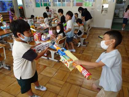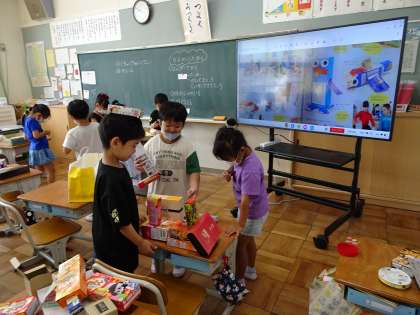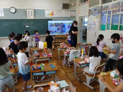 1年生の「はこでつくったよ」の続きです。こちらは1年2組です。電子黒板で作例が示されています。作った作品で戦いごっこをしていますね。
