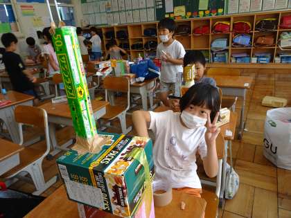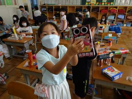 1年生の「はこでつくったよ」の続きです。カメラを構えると作品を見せてポーズをとってくれました。