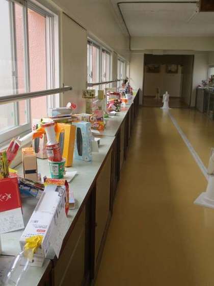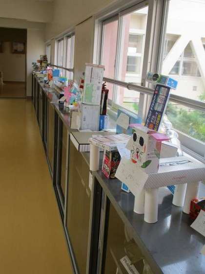 2階渡りの「鬼北美術館」に本日9/16に制作した1年生の図工作品「はこでつくったよ」が展示されました。