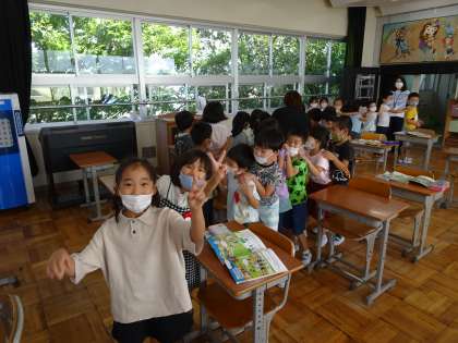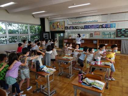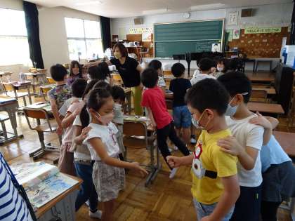 1年1組は音楽の時間です。今日は台風が通り過ぎた後、とても涼しくなって、久しぶりに音楽室で授業を受けています。授業の最初に「かもつれんしゃ」をしています。音楽がなっている間に教室内を進みますが、列車が「脱線」したり、先頭車両が速すぎて「分離」してしまったりと大変ですが、そのたびに立て直して頑張っています。