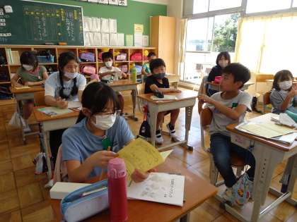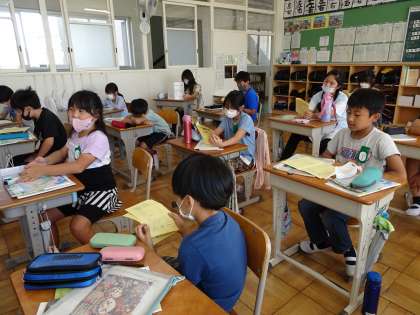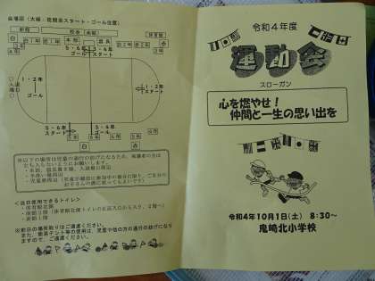運動会のパンフレットが完成しました。4年1組では、パンフレットが配られて、それを子どもたちが見入っています。
