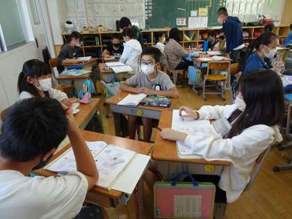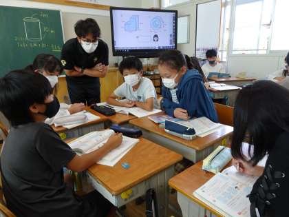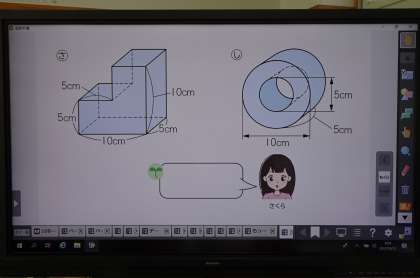 6年2組は、円柱の体積の発展問題について考えています。グループを作って、自分で考えた方法を説明しています。きちんと説明できることが学習のめあてのひとつだそうです。