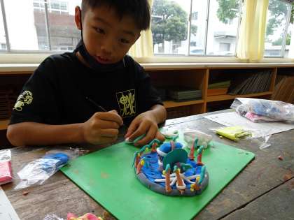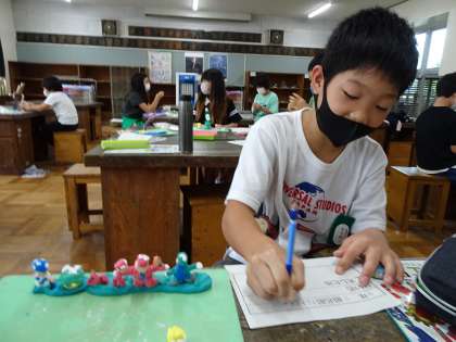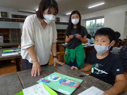 4年2組の図工「元気のおまもり」の制作風景です。完成して鑑賞カードを書いている子もいます。自分で作った色を使って、カラフルな仕上がりになってます。