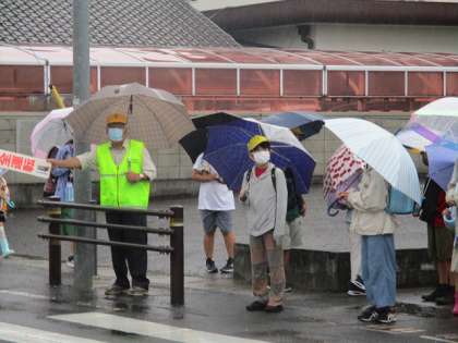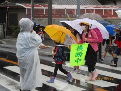 こんな天候の日も、子どもたちの安全な登校のために、交通指導員さんやスクールガードさんが見守ってくれています。