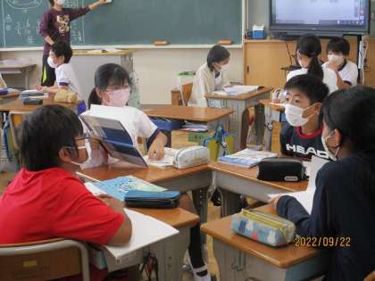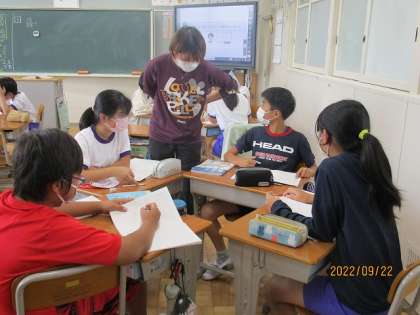 自分の考えをノートに記入した後、グループごとに伝え合う活動をしていました。