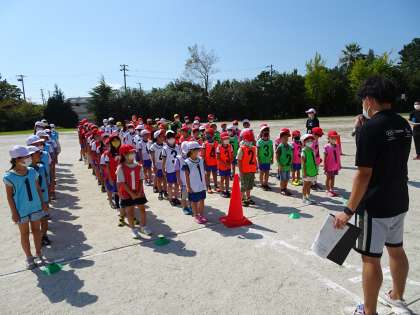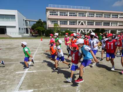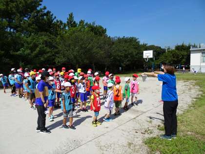大放課に代表リレーの練習をしました。最初に走る順番に並んで、お互いにあいさつをしながら自分の位置を覚えました。そこから全員で入場門前まで移動しました。