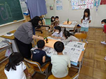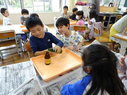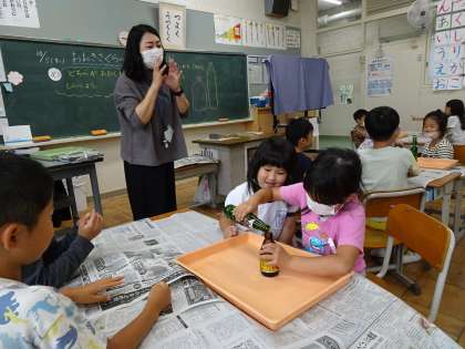 1年生は算数で、大きさくらべをしています。大きさには「長さ」「かさ(体積)」「広さ(面積)」があります。今日は大きさの異なる2種類のびんを用意して、一方に入れた水をもう片方に移し替えることを通して、「かさ」の違いとしての大きさを比べます。