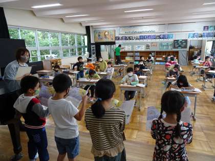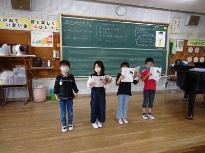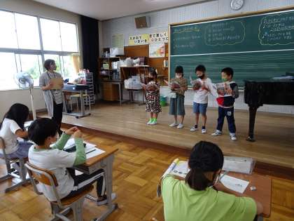 2年1組は音楽の時間で、グループごとに歌を発表しています。「虫のこえ」です。勇気を出してみんなの前で歌っています。聞いている側も真剣で、終わった後はしっかりと拍手をします。