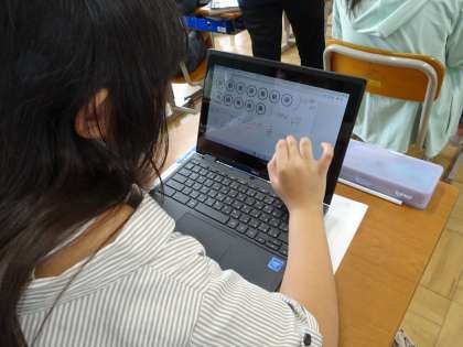 タブレットで表示された図を使いながら、自分で考えた式をタブレットに書き入れています。