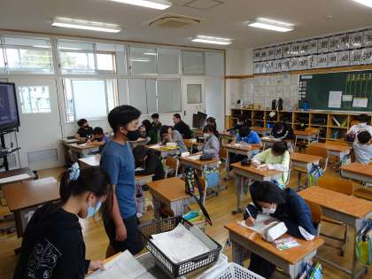 給食後に委員会を行いました。放送委員会は運動会の反省を書いています。