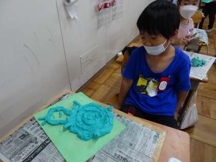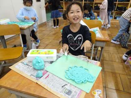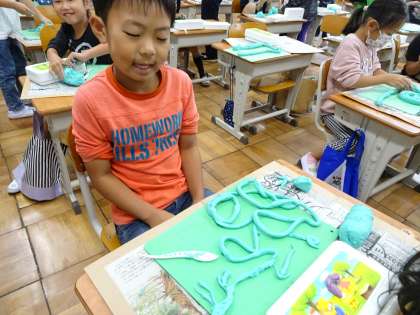 1年2組は図工で「ひもひもねんど」を制作中です。ねんどをひも状にしてから、いろいろな作品を作ります。みんなの作品を紹介します。