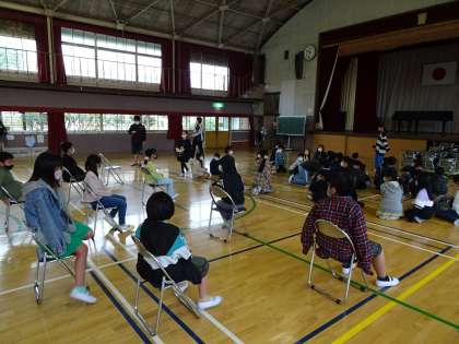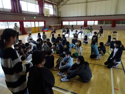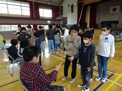 大放課に2・5年生がペア遊びをしました。今日は雨降りなので雨天時計画です。体育館と視聴覚室に分かれて、「ピラミッドじゃんけん」をしました。