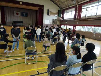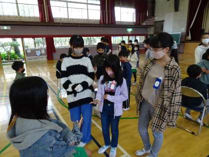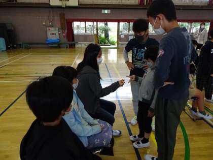 2・5年生のペア遊び「ピラミッドじゃんけん」の続きです。ペアでじゃんけん勝負をしています。5年生がリードして、2年生に勝負させてあげています。