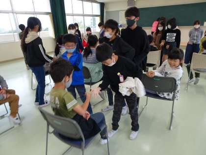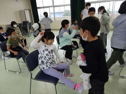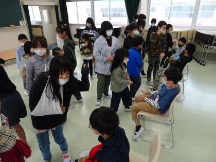 2・5年生のペア遊び「ピラミッドじゃんけん」の続きです。こちらは視聴覚室です。みんなとっても楽しそうです。