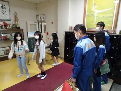 3・4時間目に4年生で防災教室を開催しました。講師として市の防災危機管理課の方々が来てくださいました。児童の代表が玄関でお迎えして、教室まで案内しました。