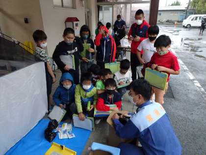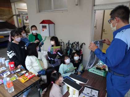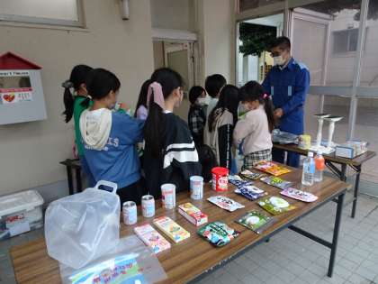 4年生の防災教室の続きです。こちらは2組です。今日は雨降りのため、玄関前に長机を置いて、そこで防災用品をおいて、災害にあったときの対応について教えてもらいました。