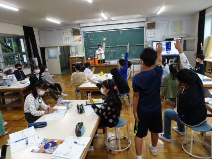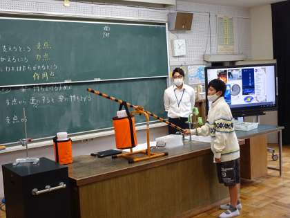 6年2組のてこの授業の続きです。さっそく実験です。挑戦したい人がたくさん手を挙げました。おもりの位置を変えると、力がいらないのはどちらでしょうか。