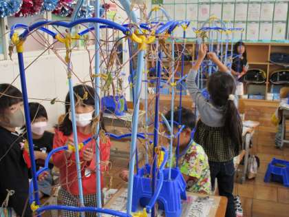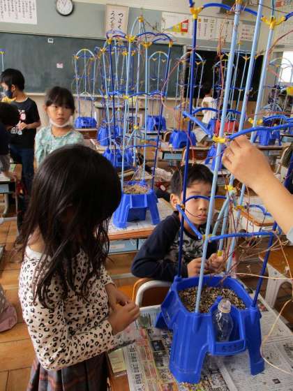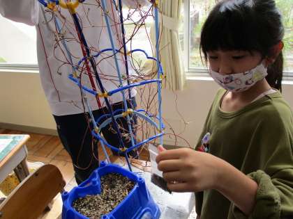 1年2組の教室では、アサガオのたね取りをしていました。