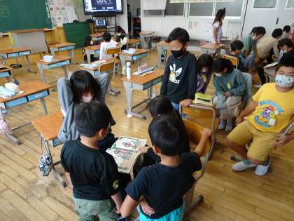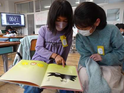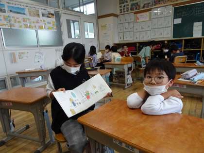 委員会の時間は1〜3年生は読書タイムです。3年2組ではこの時間を利用して読み聞かせの練習をしています。絵本を相手に見せながら読み聞かせをするのはテクニックがいりますね。
