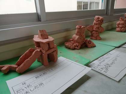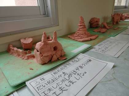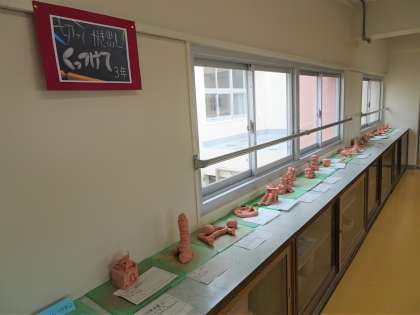 3年生の図工作品「切って かきだし くっつけて」が2階渡りに展示されています。作品を紹介します。