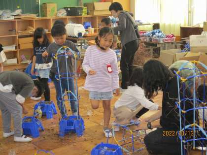 今日は、1年1組は支柱にからまったアサガオのつるを少しずつ外していく活動をがんばっていました。