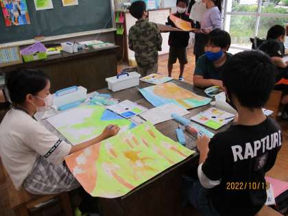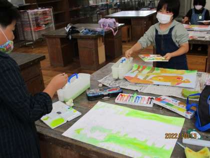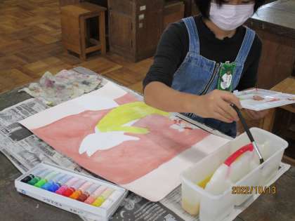 先に塗った絵の具が乾いてから、次の絵の具を重ねる。