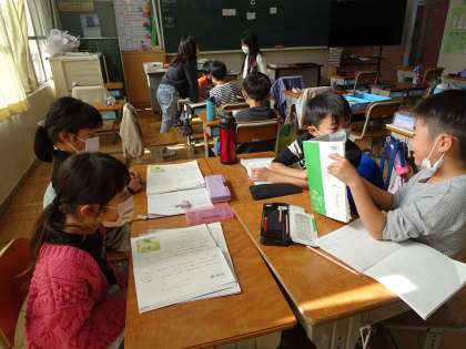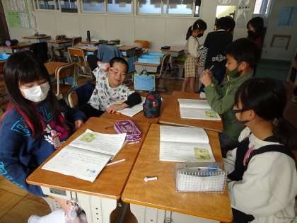 2年1組は国語の勉強で「お手紙」のグループ読みをしています。お手紙をやりとりする、がまくんとかえるくんの心温まる友情のお話です。心を込めて読みます。