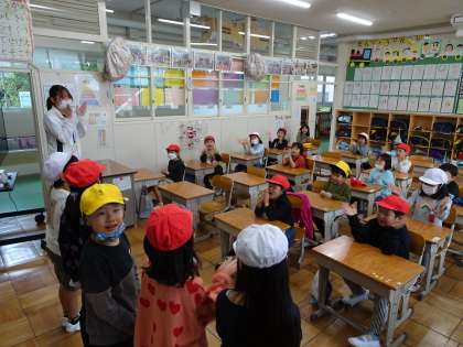 1年2組はおたんじょう会をしています。今月が誕生日の児童は5人もいました。ハッピーバースデーツーユー♪をみんなで歌いました。途中、5人の名前をみんな入れて歌いました。そのあとで記念写真も撮りました。