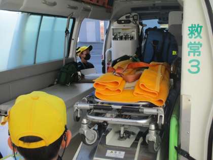 救急車や消防自動車の見学をさせてもらいました。消防車といってもいろんな種類があります。命を助けるために、たくさんの道具が積んでありました。