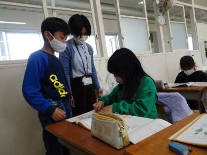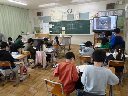 4年1組は算数の時間です。「わくわく算数ひろば」で、クイズのような問題に挑戦しています。