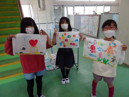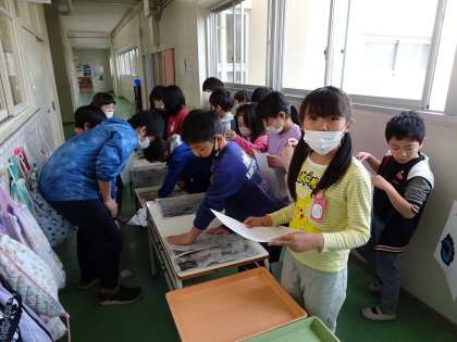 2年1組は廊下で作業をしています。見てみると、画用紙の上にさまざまな色の切り抜いたもようが貼り付けてあり、その上に水で濡らした紙をのせてばれんでこすっています。