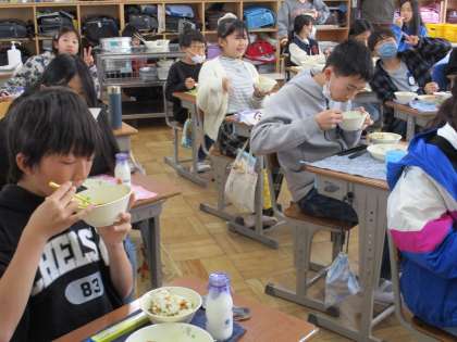 実だくさん汁は、豚肉、油揚げ、豆腐、にんじん、ねぎ、玉ねぎ、えのき、ゴボウ…