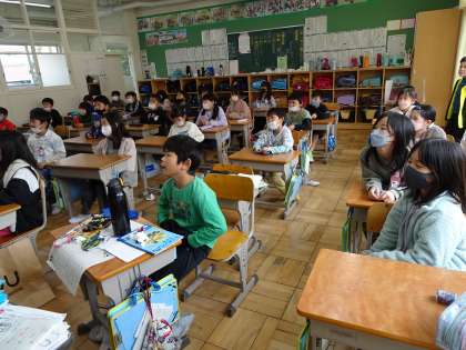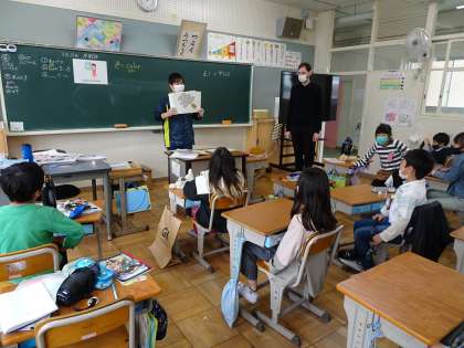 今日は2年1組にALTの先生が来て、英語の勉強をしました。担任の先生がいろいろな色のクレヨンのカードを示して、ALTの先生が色の言い方を教えてくれました。それをまねしてみんなで声をそろえて発音しています。みんなしっかりした声で発音できています。