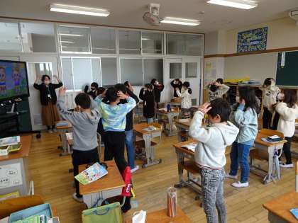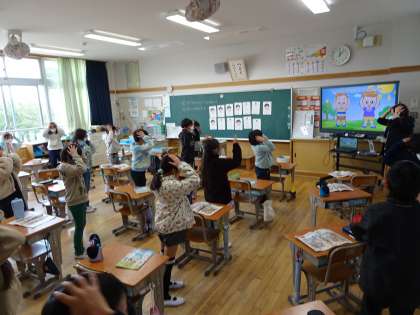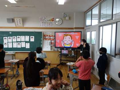 Head,shoulders,knees and toes という英語の歌と映像に合わせて振り付けをしています。歌に出てくる身体の部位に合わせて、自分の身体に手を当てています。頭、肩、膝、つま先……と素早くタッチしていきます。自然に身体の部位の表現が覚わっていきます。