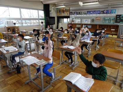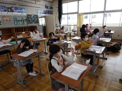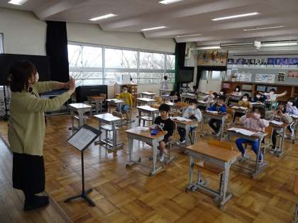 1年1組の音楽の授業の様子です。音楽は「きらきらぼし」ですが、歌っているのはなんと英語です。