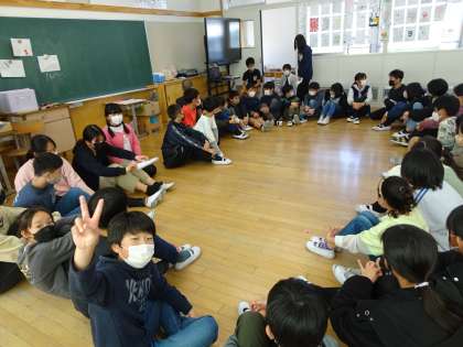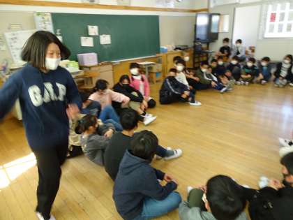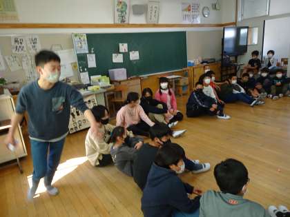 6年1組の教室ではお別れ会をしていました。童心に還って、ハンカチ落としをしています。みんなドキドキわくわく楽しそうです。
