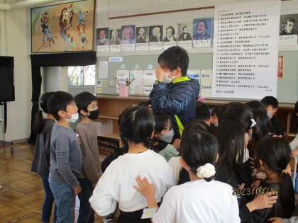 2年1組は今年度最後の音楽の授業で、担任の先生にありがとうの気持ちを伝えるサプライズコンサートをしました。