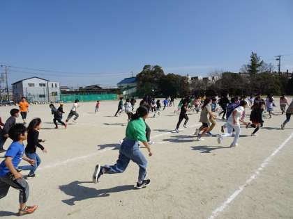 2・5年生のペア遊びの続きです。「おおかみさん、今、何時?」という鬼ごっこです。20メートルほど離れたスタートラインに並んで、声を合わせて「おおかみさん、今、何時?」と問いかけます。鬼のグループは「今、10時!」と答えます。するとみんなが10歩だけ前に出てきます。もちろんペアの子と一緒です。もう一度、「おおかみさん、今、何時?」と問いかけます。鬼が「12時!」と言った瞬間に、鬼ごっこが始まりました。