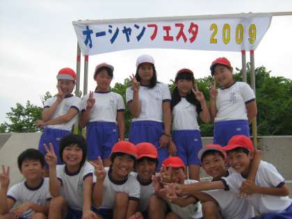 今年は『海はみんなの宝物』をスローガンに掲げ、『オーシャンフェスタ2009』と銘打ってお祭りを行いました。実行委員の子を中心に何回も話し合い、5・6年生全員で準備を行いました。