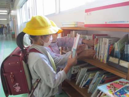 朝、1年生の教室前廊下を通りかかった4年生が、本棚の整頓をしてくれました。