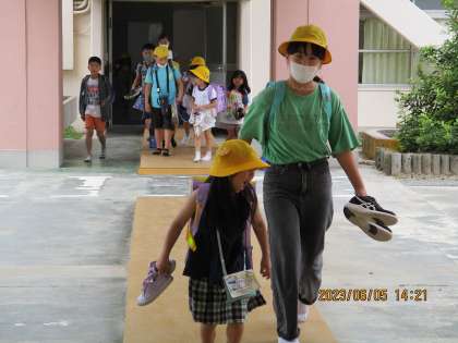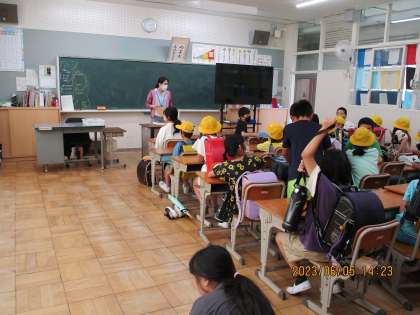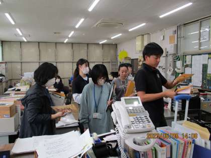 職員室では、本日の欠席者や警報時に帰宅場所が変わる児童の確認を行っています。