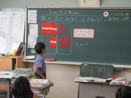 十の位、一の位について、棒で数を考えたり、筆算の式を考えたりしました。
