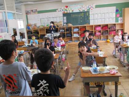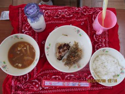 今日は、豚汁が出ました。油揚げ、豚肉、とうふ、にんじん、ねぎ、だいこんが具として入ったうまみたっぷりのお汁でした。