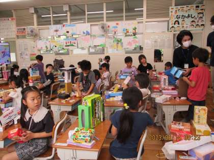 1年1組は、いろいろな形の箱を組み合わせて、自分の思い思いの物をつくりました。馬、猫、うさぎ、ロボット。上手に工夫して組み立てられました。