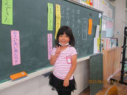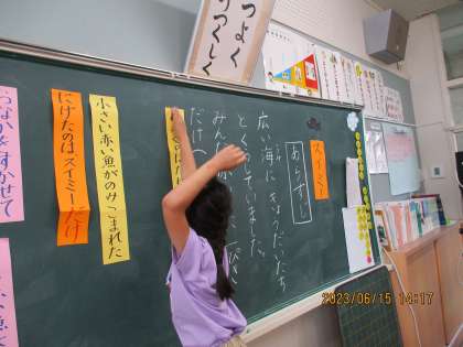 前時までに学んだスイミーのお話を振り返り、キーワードの順番を決めながら、スイミーのお話を紹介するとしたら、どんなふうに文で伝えるか…を考えました。