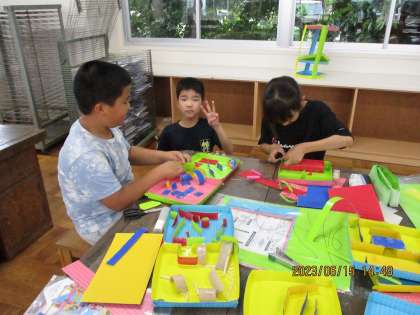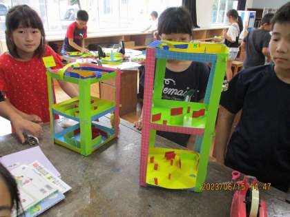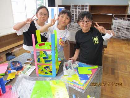 4年1組は、2組の先生に図工の「コロコロがーれ」の組み立てを教えていただきました。