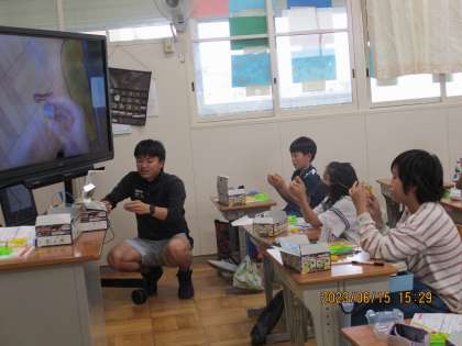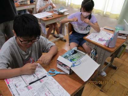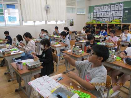 4年2組は、1組の先生に、理科「電流のはたらき」の教材を使って、組み立て方を教えていただきました。
